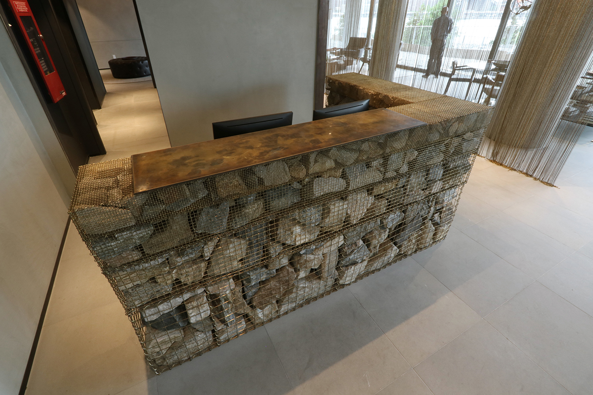Direct Metals® 123赛车边竞速边开奖 supplied brass lockcrimp cage wire mesh to a customer for creating a stunning Gabion Reception Desk.