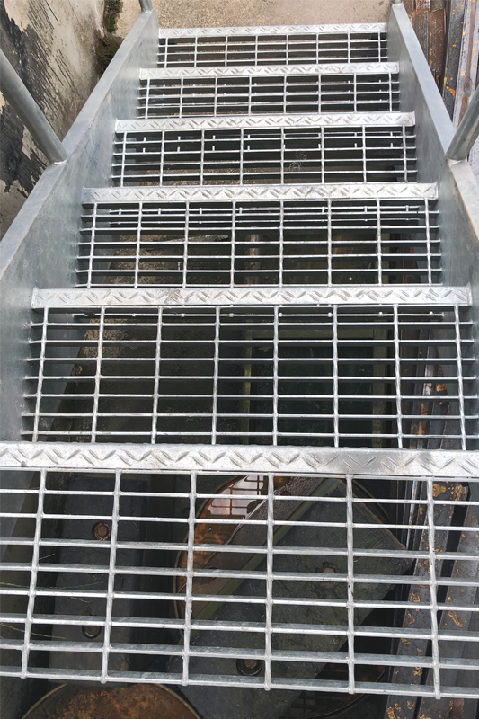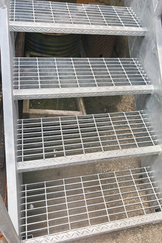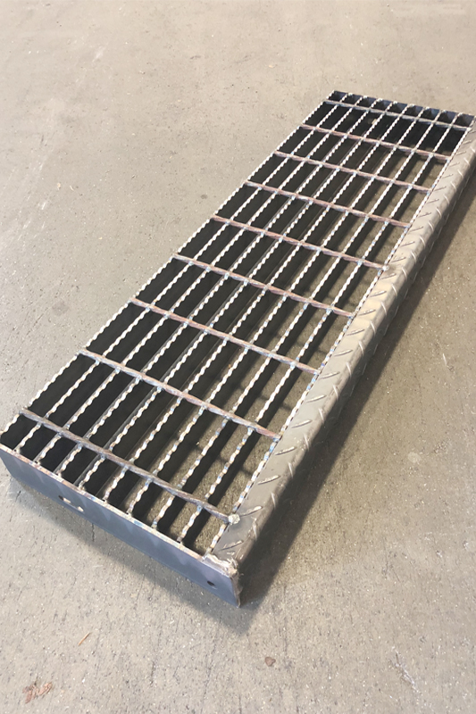 A: Stair tread grating is available in carbon steel, galvanized, aluminum or stainless-steel.
