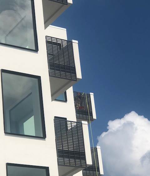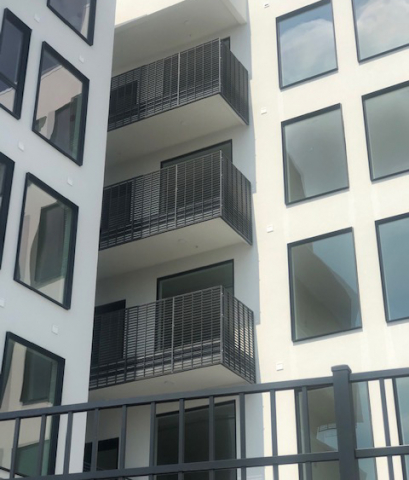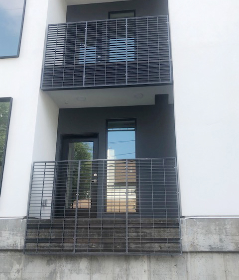 Direct Metals® supplied 2,166 sq. ft. or 116 pieces of IFR25 Slate Grey custom architectural molded fiberglass grating panels for the balcony handrail infills at a condominium complex in Nashville, TN. The fiberglass handrail infills measured 1.5" thick and were sanded smooth. The mesh pattern was a custom 2-3/8" x 8-1/2" rectangle, providing strength and a high open area for clean sight lines. The molded fiberglass grating material was chosen for this application because of its corrosion resistance and durable properties that help the handrail infills hold up to weather conditions. One of the advantages of the fiberglass is the color is throughout the product, not on the surface, such as paint on a metal railing. This enables color consistency over time if the panels are ever bumped, scratched or damaged. Fiberglass handrail infills are available in multiple colors and are easy to fabricate to meet project specifications.