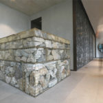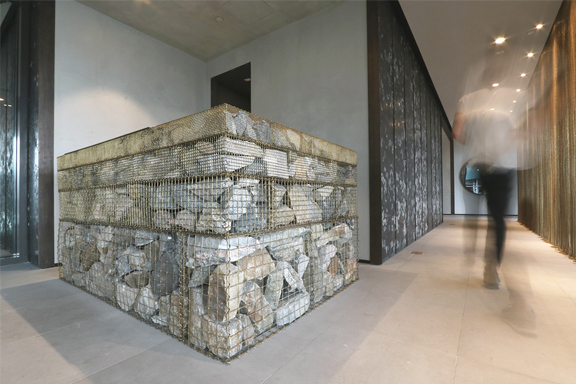 Direct Metals® supplied brass lockcrimp cage wire mesh to a customer for creating a stunning Gabion Reception Desk. The desk is comprised of eight unique brass cages of four distinct mesh openings filled with reclaimed rocks from the Brooklyn, NY area, and is a welcoming feature at a high-end residential building along Brooklyn Bridge Park. The desk covers 12 sq. ft. and stands 3 ft. 8 in. high with an approximate weight of 4,000-5,000 lbs.